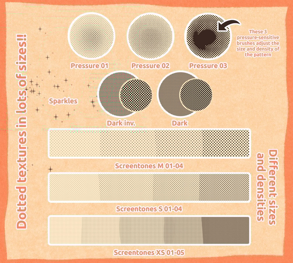 With these brushes, you can give all your digital drawings a new textured look! You don’t need to draw in grayscale to use screentones. These brushes, as you can see, work beautifully in colorful and vibrant illustrations!