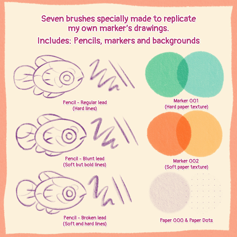 Do you want to use markers but digitally? This is the only pack you need! With just a few brushes you will get the same effect that you can see on my sketchbook illustrations. Your digital drawings will look like real scans! As if you used pencil colors and markers.