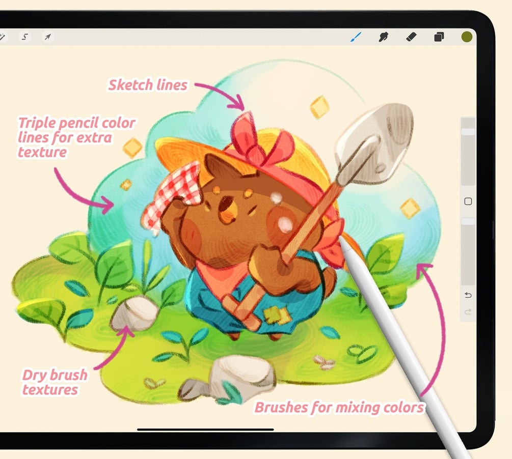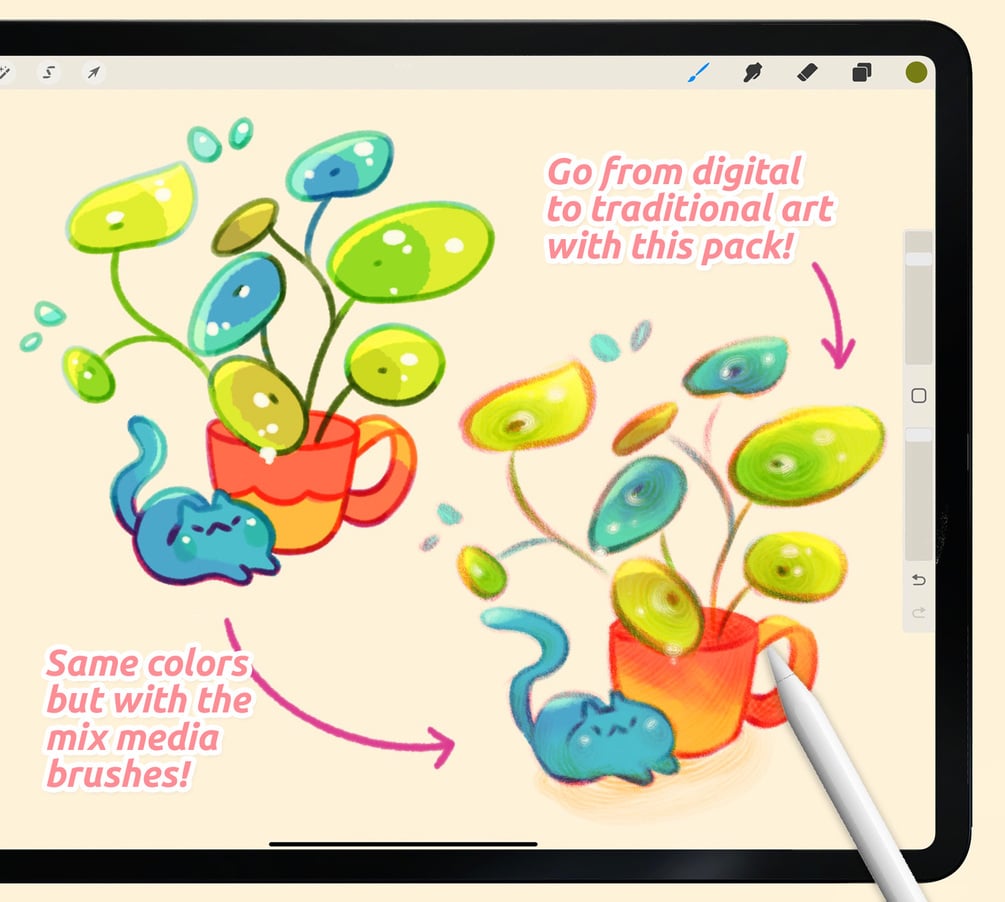Transform your digital illustrations in super cute traditional works! It has all the necessary brushes for adding extra texture and mixing colors like if they were watercolors.