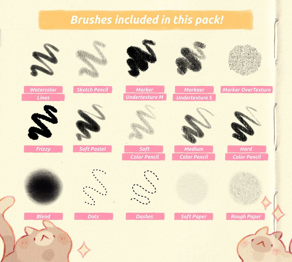 ✎ Be aware that these brushes are NOT for Procreate, although they can be exported, some of them won't work as intended due some incompatibilities. If you want the pack for your iPad, they are available in Procreate pack Vol.3.